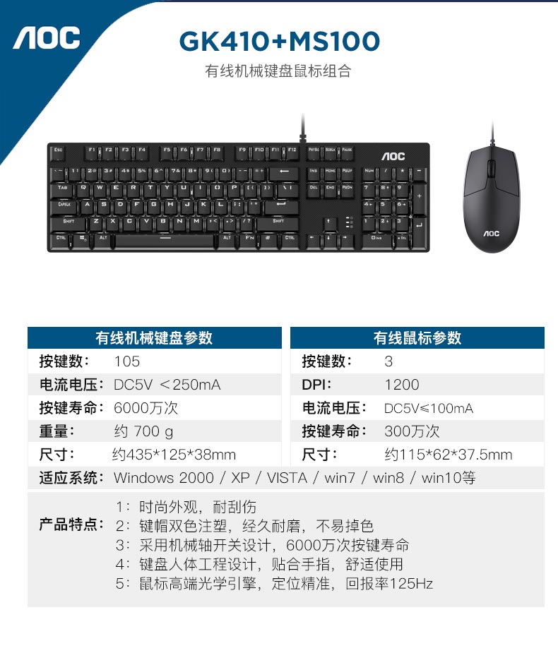 AOC GK410+MS100機械鍵盤鼠標套裝 有線鍵鼠套裝 游戲辦公 電腦筆記本鍵盤 全尺寸 黑色 青軸¥109.00